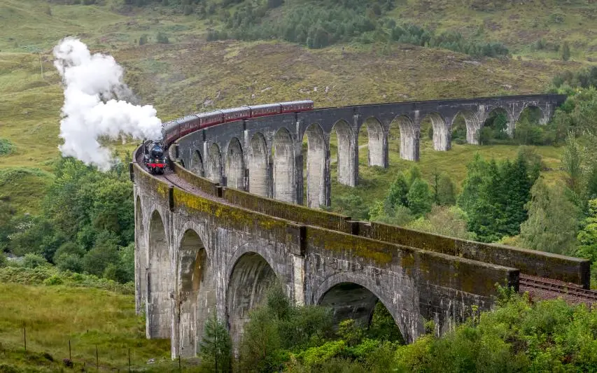 On your way to Fort William, we recommend a stop at the ruins of Doune Castle, known from several movies and tv shows. Take an audio guide Monty Python style, narrated by one of the actors. From Doune, you will drive through the Loch Lomond and The Trossachs National Park and on to the breathtaking Glencoe Valley, where you will stay for two nights. On the second day, you can visit the Glenfinnan monument. At the parking lot you will find a viewpoint, from where you have a beautiful view over the monument and over the Glenfinnan viaduct. You might even spot the Jacobite steam train, now also known as the Hogwarts Express. Continue over the A830 and take the ferry from Mallaig to Armadale to visit the Isle of Skye. Take the bridge back to Kyle of Lochhals and visit Eilean Donan Castle.